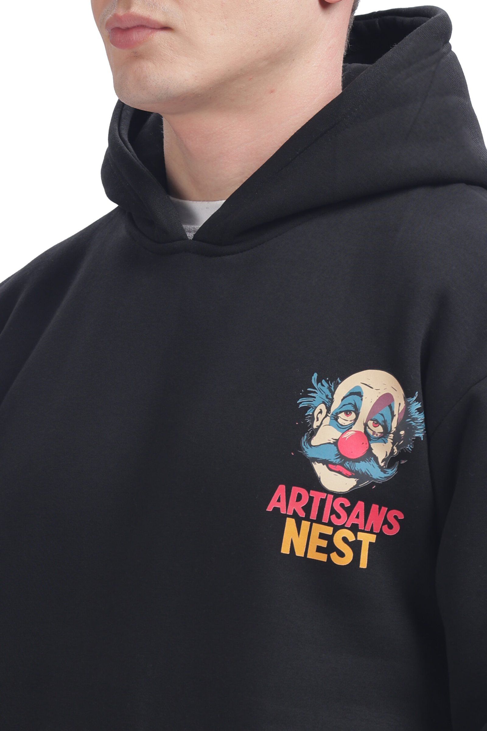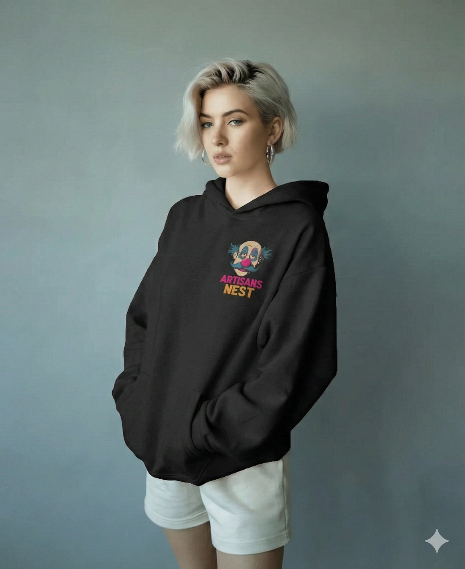 A bold hand-drawn trippy clown sits loud on the back with neon pops, smoke trails and graffiti typography, giving pure underground poster vibes. Front hit keeps it tight with the Artisans Nest mascot so you rep the tribe without saying a word.