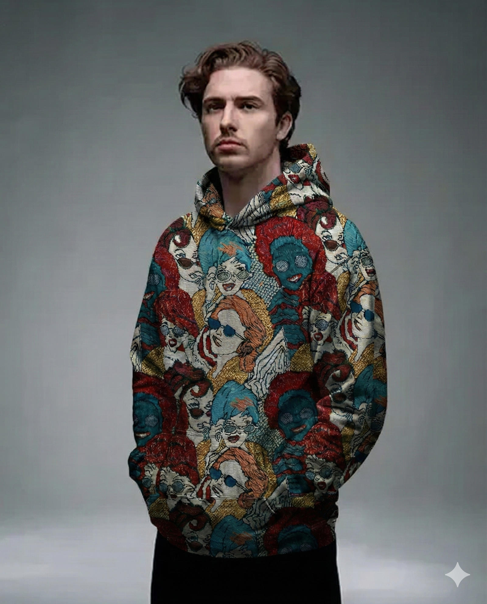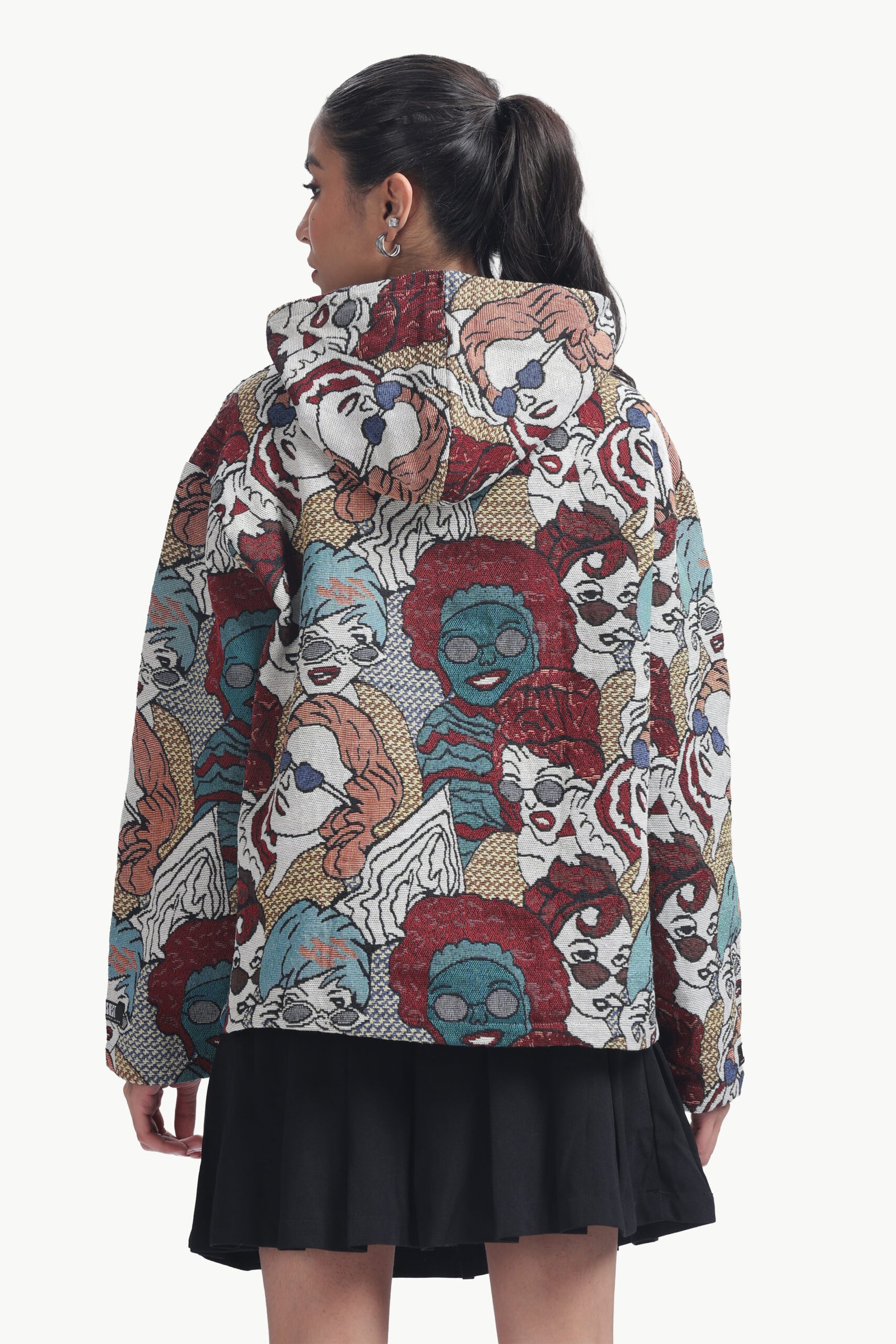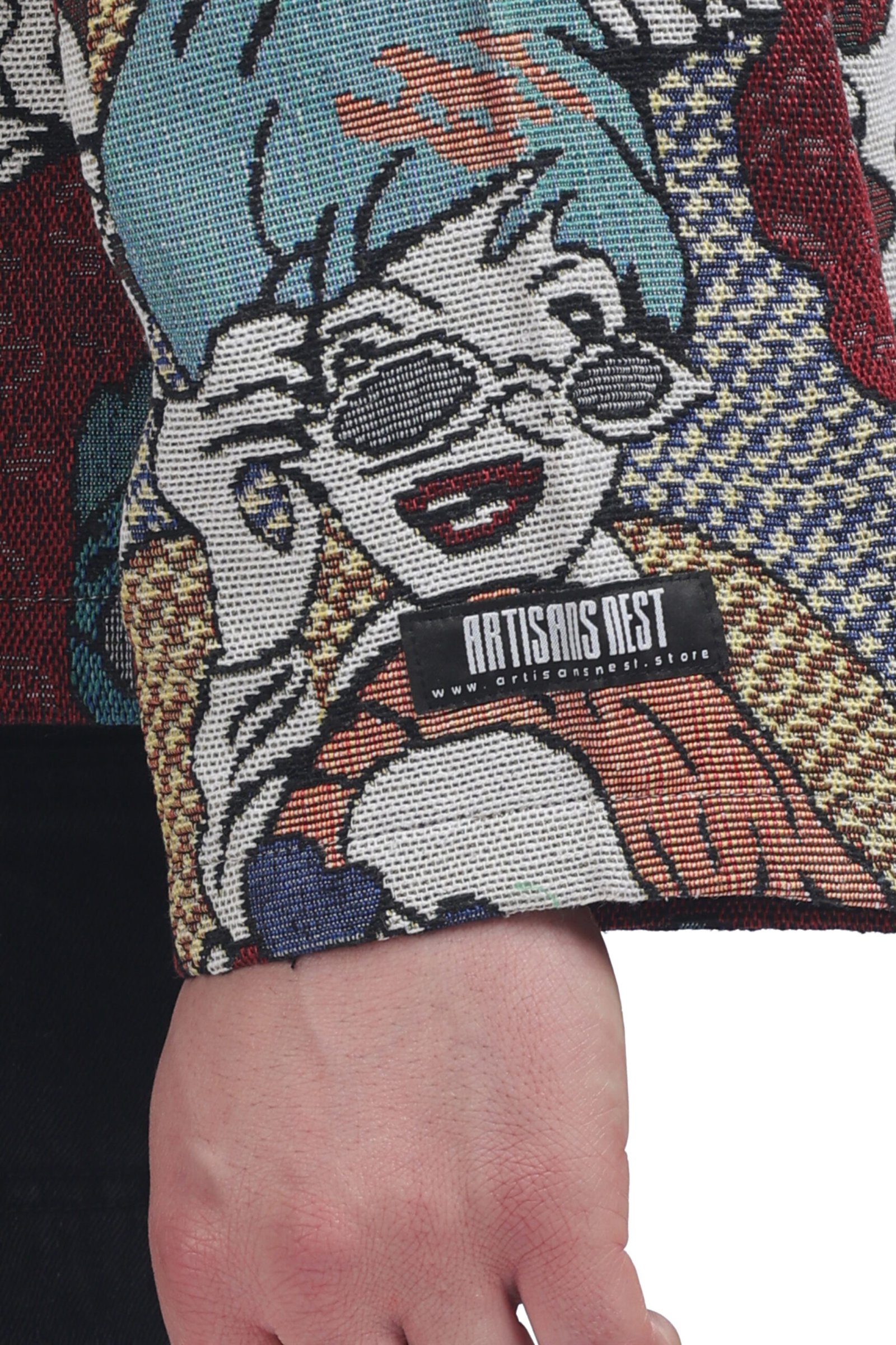 ✔ All-over woven graphic design featuring expressive character illustrations